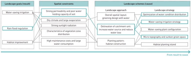 以西北干旱半干旱区海绵城市绿色基础设施生态规划设计情境为例,进行简要因果链条机制分析。首先明确了景观目标(雨洪调节),其次分析了影响景观目标的空间约束条件(土壤渗透性强、持水性差),进而提出了景观途径(开源节流)与具体的景观策略(水分条件分布优化、微地形、下凹绿地等)。
