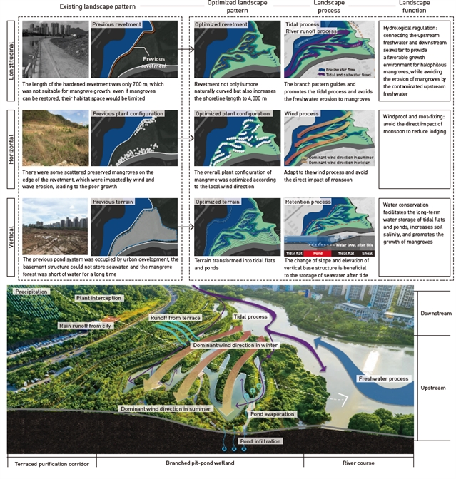 2)生境修复策略:根据红树林生物特征(喜盐、易倒伏),分提出枝杈状的坑塘湿地格局,即通过改变河流廊道、驳岸等横/竖向景观结构,营造适宜红树林生长的生存环境。