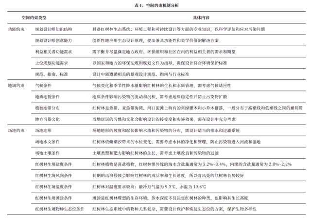 本文提出的空间约束机制空间约束机制更注重场地导向的实践优位与整体主义。空间约束限制分析涵盖规划设计师知识结构、创意能力及利益相关者功能需求等功能约束,气候条件、地质地貌条件等地域约束,以及场地地形、场地水文条件等场地约束的识别和应对。从初始的具有普适性和通用性的空间应用原型,到增加了特定功能属性和需求的功能类型,再到结合具体地域环境及地方性知识、具有复杂设计约束限制的生态规划设计类型,规划设计方案最终落位于场地。