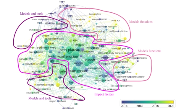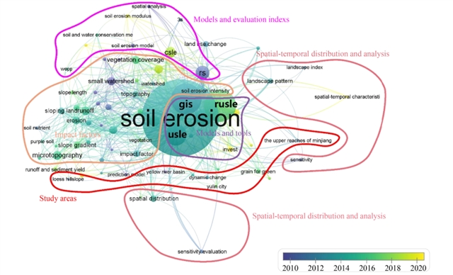 图1、图2反映了过去十几年中国土壤侵蚀模型的研究热点及其随时间变化情况。最热门的关键词按降序排列包括“RUSLE”、“GIS”、“Loess Plateau”、“Runoff”、“USLE”、“Land use”、“Spatial distribution and variation”、“Surface runoff and sediment yield”、“Impact”、“Model”、“Micro-topography”、“Watershed”、“Steep slope”。2012年前研究主要是基于USLE与GIS技术对土壤侵蚀的模数、强度进行评价,研究区域以黄土高原为主,侵蚀形态主要是细沟和沟蚀。2012–2018年期间,以土壤侵蚀影响因子研究为主,研究区域主要是黄土高原和东北黑土区。2018年之后,主要应用RUSLE、CSLE对土壤侵蚀进行评价,同时开始研究土壤侵蚀过程与侵蚀形态,并分析土壤侵蚀时空分布特征及变化。