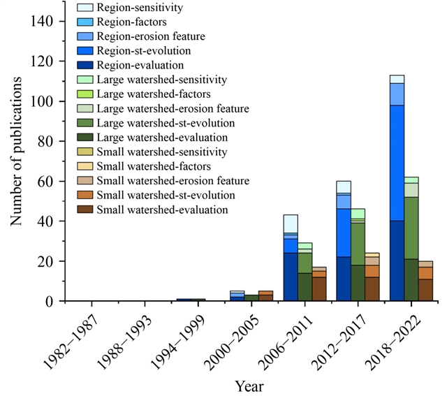 在过去40年中,出版数量最多的研究集中于模型应用研究。其次是土壤侵蚀的定性评估、模型构建和模型修正。在2000年之前,研究的主要重点是模型构建,其次是模型应用。这些研究大多数涉及经验模型的构建,而模型应用主要集中在土壤侵蚀的评估和空间分布。