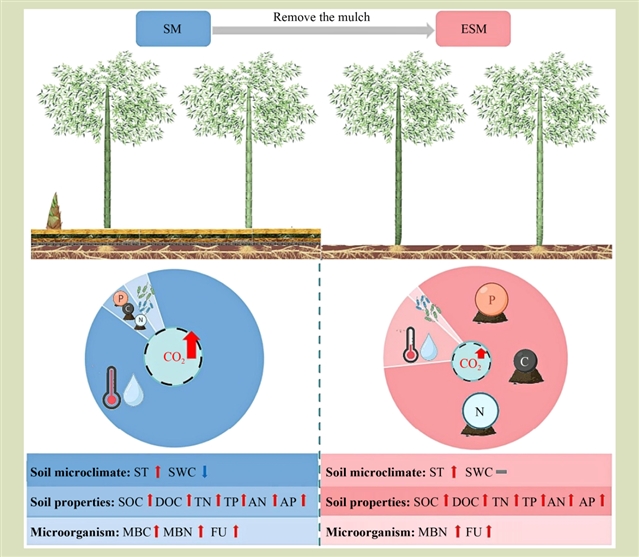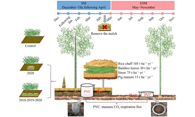 土壤呼吸 (Soil Respiration, Rs) 是陆地生态系统碳循环的关键环节,其动态直接影响人工林碳汇功能的精准评估。在全球人工林集约化经营背景下,秸秆覆盖作为典型可持续管理措施,通过调控土壤微环境与生物活性显著改变Rs通量特征。然而,现有研究多关注秸秆覆盖农田的即时效应,对人工林及其遗留效应及其长效调控机制仍缺乏系统认知。基于此,本研究以亚热带毛竹 (Phyllostachys edulis) 林 (占中国竹林总面积70%) 为对象,探究秸秆覆盖措施对毛竹林Rs的持续影响机制。本研究创新性提出双阶段假设:(1) 即时效应期(覆盖期):秸秆覆盖通过水热条件优化驱动CO2通量激增;(2) 覆盖遗留期:移除覆盖物后,秸秆覆盖物遗留的碳氮富集持续刺激微生物代谢活性,进而提高土壤CO2通量。本成果揭示秸秆覆盖措施对湿润区毛竹林的土壤碳循环双阶段调控规律,为优化竹林碳汇管理、协调生态效益与经济效益提供理论支撑。