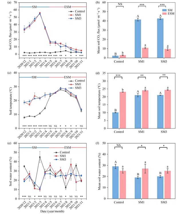 图2 覆盖经营对毛竹林土壤CO2通量、土壤温度和含水量的月变化 (a、c、e) 及平均值 (b、d、f) 的影响。Control:无秸秆覆盖;SM1:秸秆覆盖一年;SM3:连续三年秸秆覆盖。★表示2020年12月至2021年11月期间各处理之间的显著差异 (NS,不显著;★,p < 0.05;★★,p < 0.01和★★★,p < 0.001)。大写字母表示覆盖期 (SM) 各处理之间的显著差异 (p < 0.05)。小写字母表示在遗留效应期 (ESM) 各处理之间的显著差异 (p < 0.05)。*表示在相同的覆盖处理下,SM和ESM之间的显著差异 (NS,不显著;*,p < 0.05;**,p < 0.01和***,p < 0.001)。