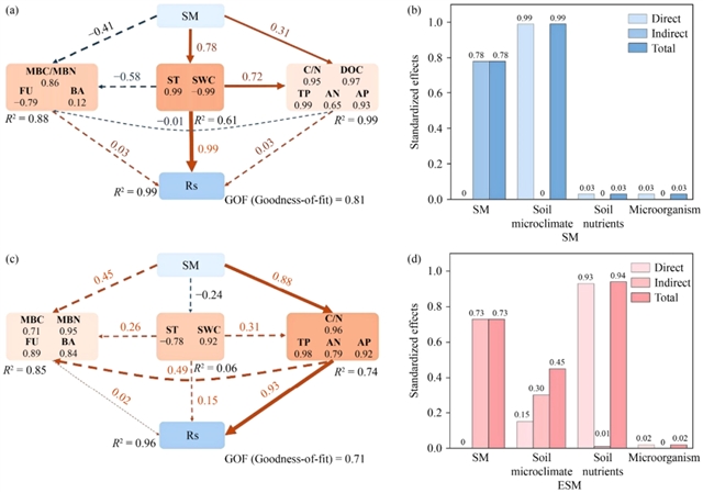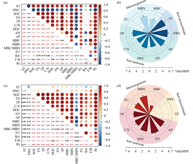 图3 秸秆覆盖期 (a、b) 和遗留期 (c、d) 土壤呼吸与生物和非生物因素的关系。随机森林分析用于确定土壤微气候 (ST和SWC)、土壤性质 (TP、DOC、AN、AP和C/N) 和微生物因素 (MBC、MBN和FU) 在覆盖期 (b) 和遗留效应期 (d) 期间对Rs的相对重要性。ST,土壤温度;SWC,土壤含水量;DOC,溶解有机碳;AN,有效氮;TP,总磷;AP,有效磷;C/N,有机碳/总氮比;MBC,微生物生物量碳;MBN,微生物生物量氮;MBC/MBN,微生物生物量碳对微生物生物量氮的比值;FU,真菌基因丰度;BA,细菌基因丰度;F/B,真菌基因丰度与细菌基因丰度的比率。*,p < 0.05**;p < 0.01;***,p < 0.001。