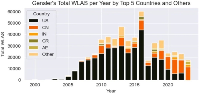 ▲ 图四:gensler 事务所年度总 wlas 的跨国分布。该图表重点呈现 wlas 总分最高的前五个国家的贡献值,并将其他国家归为 “综合类别”。这一可视化分析有助于快速识别 gensler 全球项目活动趋势及 leed 认证的地理分布特征。©本文作者