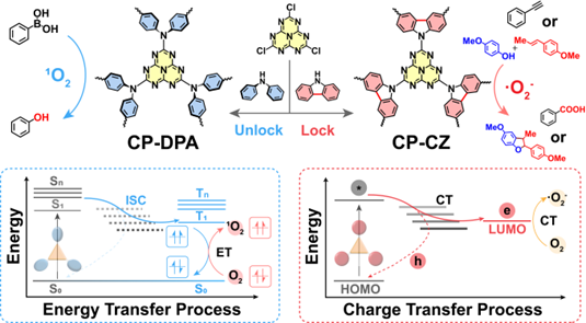 本文通过对CPs构筑单元内仅一根化学键的改变,成功制备了两种具有不同催化行为的七嗪基CPs材料。由于苯环之间的旋转,CP-DPA的激子更容易发生ISC产生三重态激子,进而通过能量传递产生1O2。CP-DPA在1O2驱动的苯硼酸氧化反应中呈现出超高的光催化活性和选择性。相比之下,由于化学键的固定,CP-CZ的激子解离能力更强,更倾向于发生电荷转移产生·O2-。CP-CZ在·O2-驱动的苯乙炔氧化和[3+2]环加成反应中表现出优异的光催化活性和选择性。这项工作为在原子尺度上通过调节光催化剂的组成和结构来调控ROS的生成提供了重要的参考和启示。