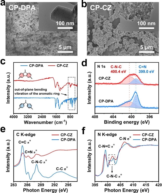 扫描电子显微镜(SEM)和透射电子显微镜(TEM)显示CP-DPA呈现出不规则的短棒结构,而CP-CZ则主要由不规则的颗粒状超结构堆积而成。红外(IR)光谱中七嗪单元等特征峰的保留,同时粉末X射线衍射(XRD)结果观测到CPs材料的典型无定形特征,证实了七嗪基CPs的成功制备。此外,CP-DPA在680-810 cm-1处出现了多个C−H的面外弯曲振动峰,这可能与其苯环旋转导致的对称性降低有关。X射线吸收近边结构(XANES)结果表明,在CPs的C K边谱图中,CP-CZ的C=N与C-N-C信号强度明显高于CP-DPA,这可能是由于CP-CZ的共轭性更高,电子更离域所致。此外,CP-DPA的N K边谱图观测到C-N-C π*发生分裂,这表明苯环发生旋转后,由于不同位点的C原子偏转程度不同,CP-DPA表现出不同的C-N-C环境。