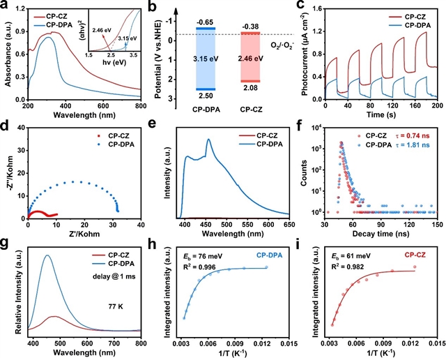 图2 (a) CPs的UV-Vis DRS(插图:对应的Tauc图)。(b) CPs的能带结构。(c) CPs的瞬态光电流。(d) CPs的EIS图。(e) 300 K下CPs的PL光谱。(f) CPs的TR-PL。(g) 77 K下延迟1ms时CPs的磷光光谱。(h) CP-DPA和 (i) CP-CZ的积分PL强度随温度的变化。Eb由阿伦尼乌斯方程导出。