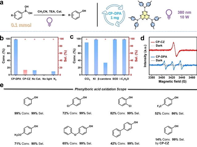 图3 (a) 光催化苯硼酸氧化反应示意图。(b) 光催化苯硼酸氧化的控制实验。(c) CP-DPA催化苯硼酸氧化的自由基捕获实验。(d) 在可见光照射下,CPs在TEMP存在下的ESR光谱。(e) CP-DPA催化的不同苯硼酸底物。