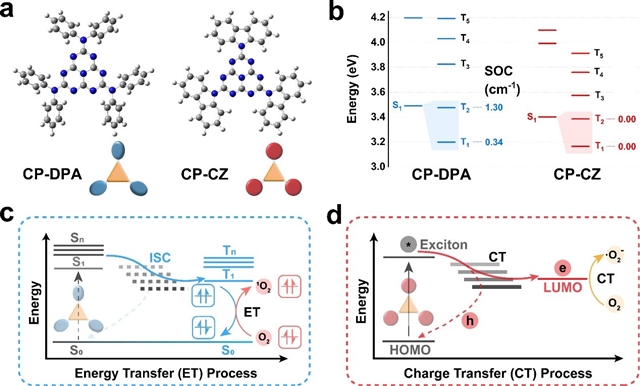 图5. (a) DFT优化的CPs结构。(b) 理论单重态和三重态垂直激发能及S1和Tn的SOC常数,其中SOC为理论自旋轨道耦合常数,单位为cm-1。(c) CP-DPA通过能量转移过程活化O2的光催化机理。(d) CP-CZ 通过电荷转移过程活化O2的光催化机理。