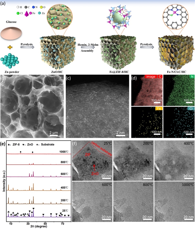 图1(a)Fe-N/Cl-C/HC的制备流程图。(b)SEM图像。(c)STEM图像。(d)STEM-EDS图像。(e)Fe@ZIF-8/HC结构演变的原位XRD图谱。(f)原位TEM图像。