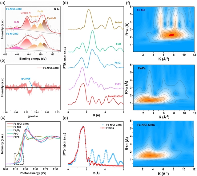 图2(a) Fe-N/Cl-C/HC和Fe-N-C/HC的N 1s XPS谱。(b)Fe-N/Cl-C/HC的EPR谱。(c) Fe-N/Cl-C/HC及参考样品的Fe K边缘XANES。(d)K边缘k2加权FT-EXAFS谱。(e)Fe-N/Cl-C/HC在R区域的FT-EXAFS谱及其拟合曲线。(f)Fe-N/Cl-C/HC及参考样品的WT图。