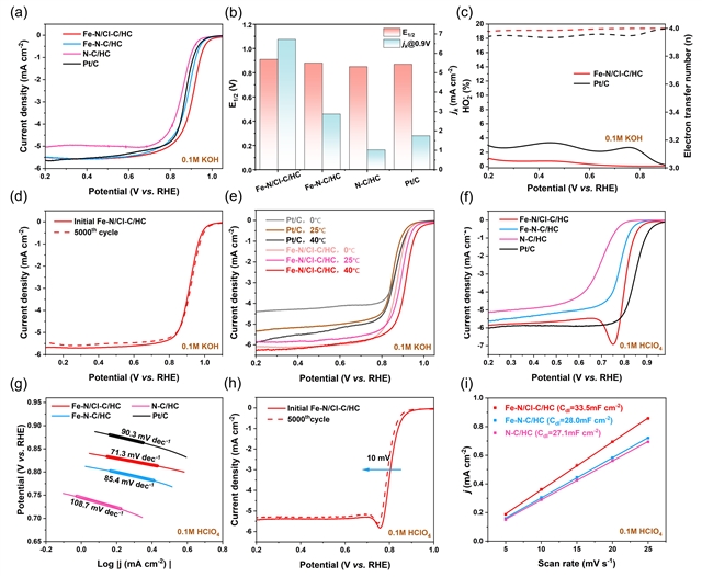 图3(a)0.1 M氢氧化钾中ORR性能:Fe-N/Cl-C/HC、Fe-N-C/HC、N-C/HC和Pt/C的RDE曲线及(b)性能对比。(c)Pt/C和Fe-N/Cl-C/HC的n(虚线)和过氧化氢产率(实线)。(d)Fe-N/Cl-C/HC在5000次电位循环前后的 RDE曲线。(e)不同温度下Pt/C和Fe-N/Cl-C/HC的RDE曲线。(f)0.1 M HClO4中ORR性能:Pt/C、N-C/HC、Fe-N-C/HC和Fe-N/Cl-C/HC的RDE曲线及(g)Tafel图。(h)Fe-N/Cl-C/HC在5000次电位循环前后的RDE曲线。(i)N-C/HC、Fe-N-C/HC和Fe-N/Cl-C/HC的双电层电容图。