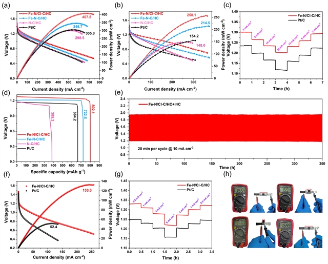 图4 Zn-O2和Zn-air电池性能评估:(a)液态电池在Zn-O2条件下以及(b)Zn-air条件下的功率密度曲线。(c)不同电流密度下液态ZAB的放电曲线。(d) 在10 mA cm-2的放电曲线。(e)液态可充电ZAB在10 mA cm−2下的恒流充放电循环曲线。(f)固态ZAB电池在不同电流密度下的功率密度曲线。(g)在2 mA cm-2的放电曲线。(h)使用Fe-N/Cl-C/HC作为空气电极的柔性固态ZAB在不同弯曲角度下的开路电压变化。