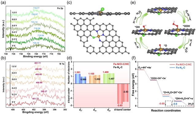 图5 (a) 记录测试施加不同电位从1.0 V到0 V的Fe-N/Cl-C/HC的 Fe 2p XPS和(b)N 1s XPS光谱。(c)Fe-N/Cl-C/HC的计算模型。(d)dyz、dxz和dz2轨道中填充的电子数以及Fe d带中心在Fe-N/Cl-C/HC和Fe-N4-C模型中的位置。(e)ORR中Fe-N/Cl-C/HC的示意图。(f)ORR在T = 298 K、pH = 1和U = 0 V时的自由能图。