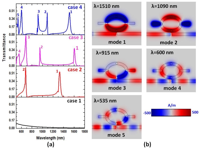 (2) 由于椭圆环形谐振器的窄带模式和两个分离的MIM WGs的宽带模式之间的相互作用,所设计的结构支持五个范诺共振模式通道,折射率传感最大灵敏度可达4500 nm/RIU,温度灵敏度可达1.00 nm/°C。