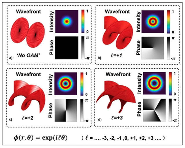(2) 介绍了轨道角动量的背景,以及在空间中生成轨道角动量的各种方法,例如使用螺旋相位板、柱面透镜和其他将入射高斯光束转换为具有扭曲波阵面的光束(也称为拉盖尔-高斯模式)的方法。