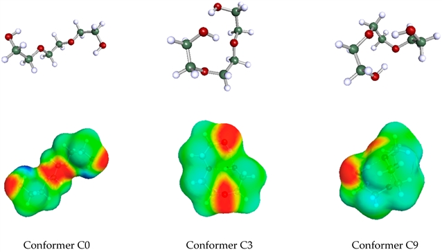 图例:三乙二醇三种构象异构体的 COSMO 几何结构(上)和 COSMO 表面(下)。下图中酸性位点用深蓝色标记,碱性位点用深红色标记。