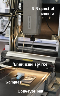 图3 该图像突出了HSI平台的关键组件,包括近红外光谱相机(Specim, Oulu, Finland),相关的能量源,光学和传输样品的传送带。