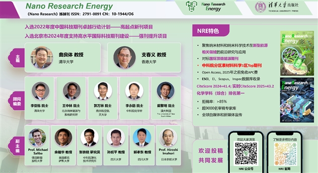 Nano Research Energy 是中国科学院分区表材料科学一区Top期刊,2022年6月由清华大学创办,主编为清华大学曲良体教授和香港大学支春义教授,清华大学出版社自主研发国际化数字出版平台SciOpen为本刊唯一发布平台。本刊聚焦纳米材料和纳米科学技术在新型能源相关领域的前沿研究与应用,对标国际顶级能源期刊,已入选2022年度中国科技期刊卓越行动计划——高起点新刊项目,北京市2024年度支持高水平国际科技期刊建设——强刊提升项目。2024年CiteScore为41.4,化学学科(综合)排名第一。已被Web of Science ESCI数据库收录、2026年JCR将公布首个影响因子(预估IF>20)。本刊为开放获取,2025年底之前免收APC费。期刊官网:https://www.sciopen.com/journal/2791-0091。本刊是一本真正的国产期刊,欢迎有志于投身国产期刊崛起,愿意加入本刊编委/青年编委的科研工作者,联系本刊编辑部负责人薛王欣老师(Email: xuewx@tup.tsinghua.edu.cn)。