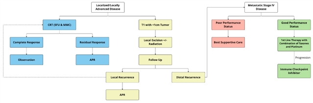 总体而言,过去二十年来,肛门癌的治疗取得了进展。然而,以5-氟尿嘧啶和丝裂霉素C为代表的同步放化疗仍然是早期和局部晚期疾病的标准治疗方法。靶向治疗或免疫治疗与同步放化疗联合或单独使用的作用目前尚不清楚。一小部分低危T1期癌症患者可以接受局部切除术治疗。约20%-30%的患者会出现复发,需要进行挽救性腹会阴切除术。对于转移性患者,含铂化合物和紫杉烷类药物的联合化疗是治疗的主要手段。如果病情进展,检查点抑制剂是标准选择。对于肝转移灶有限的特定患者,可考虑肝转移灶切除术。HPV疫苗是降低HPV相关肛门癌风险的重要长期策略。由于治疗相关的并发症和复发风险,个体化治疗(包括升级或降级治疗)对于改善肛门癌患者的预后至关重要。