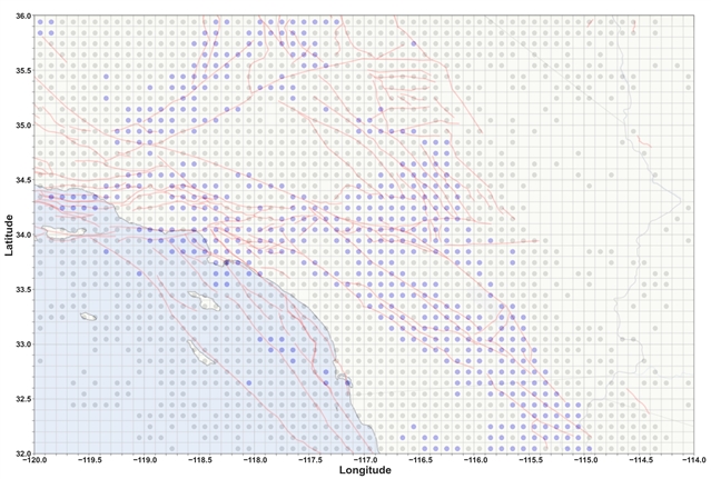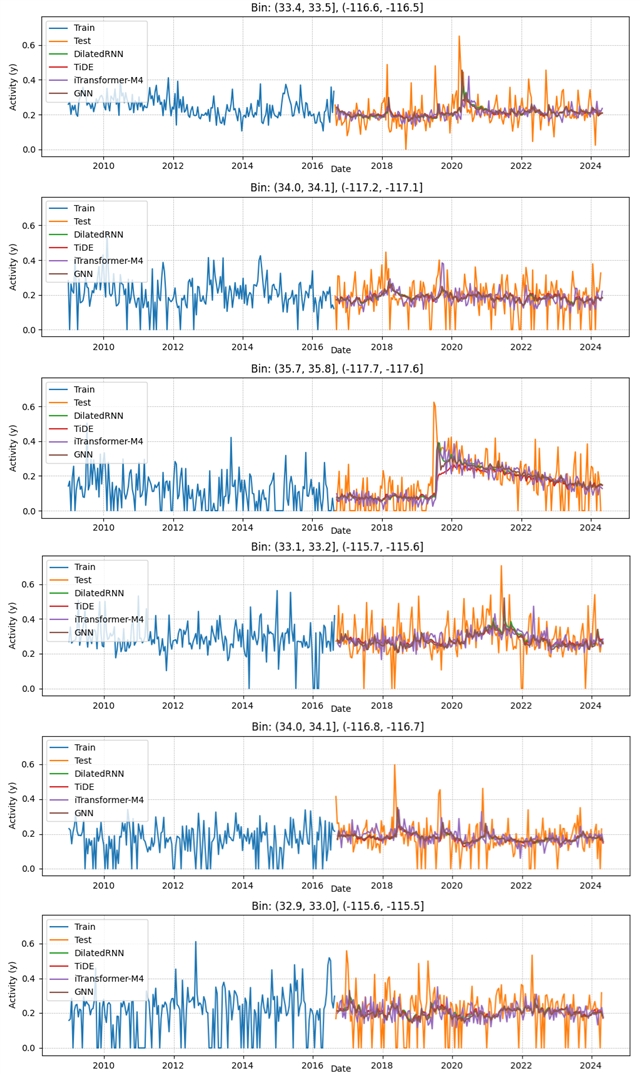 本研究聚焦美国南加州地区(北纬32°至36°,西经114°至120°),将1986-2024年的地震数据按0.1°×0.1°的空间网格划分为2400个空间单元,从中筛选出500个地震活动最频繁的网格作为研究对象。研究团队创新性地将地震临近预测转化为时间序列预测问题,采用对数能量释放量作为关键指标,计算公式为logEn=1/1.5×log10(∑10^(1.5×mquake)),其中mquake表示地震震级。通过计算每14天时间窗口内的累计对数能量释放量,构建了每个空间单元的地震时间序列,为深度学习模型提供了标准化输入。