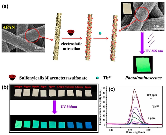 图1.基于静电纺纳米纤维的水污染物化学传感器;(a) 磺酰基杯芳烃功能化APAN纳米纤维吸附去除Tb3+的制备工艺及光致发光行为;(b) 浸入Tb3+水溶液 (0—100 ppm) 后的NFs照片;(c) NFs的荧光光谱。