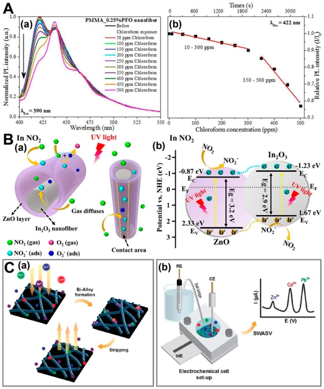 图2.用于气体污染物的静电纺nfs化学传感器;(A) PL光谱;(B) In2O3/ZnO异质结及相应能带图;(C) PEDOT/PVA/AgNPs-纤维改性SPCE的制备。