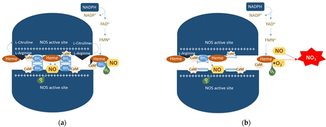 图 4. ( a )一氧化氮合酶偶联反应。( b ) 一氧化氮合酶解偶联反应。