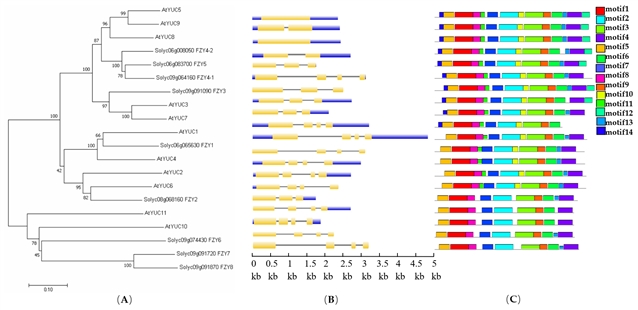 番茄FZY基因家族的(A)系统发育树,(B)基因结构分析,和(C)基序。