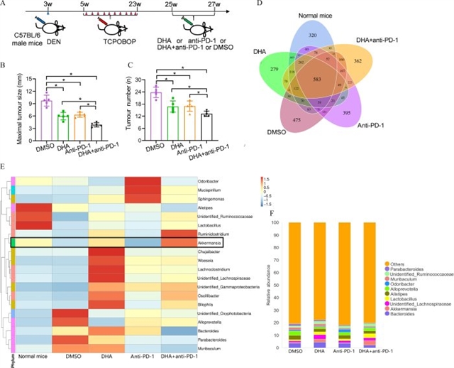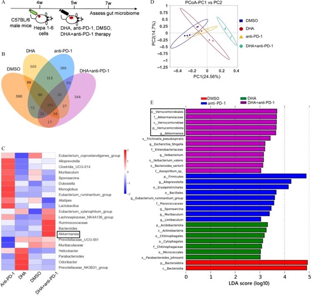 图1 C57BL/6肝癌小鼠的抗PD-1治疗期间,DHA增加了嗜黏蛋白阿克曼氏菌的丰度