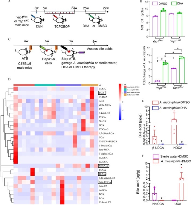 肝细胞癌(HCC)是全球癌症相关死亡的第三大原因,其治疗面临严峻挑战。尽管抗程序性死亡蛋白-1(PD-1)免疫疗法在部分肿瘤中效果显著,但在HCC患者中的有效率仅为15%–20%。近年研究发现,肠道菌群中的嗜黏蛋白阿克曼氏菌(Akkermansia muciniphila)丰度与抗PD-1疗效密切相关,而HCC早期患者肠道内该菌丰度显著降低。另一方面,Yes相关蛋白1(YAP1)作为Hippo通路的核心效应分子,在HCC肿瘤细胞中高表达,且与免疫抑制微环境形成相关。双氢青蒿素(DHA)是一种已被美国FDA批准的抗疟药物,具有抗肿瘤潜力,但其是否通过调节YAP1和肠道菌群影响HCC免疫治疗尚不清楚。