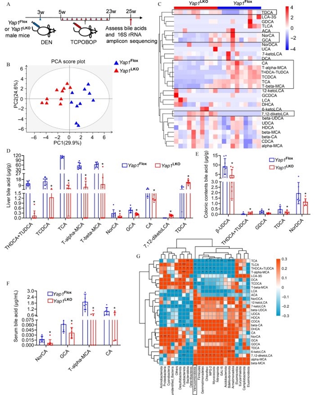 图5 YAP1导致结肠中嗜黏蛋白阿克曼氏菌丰度降低,与胆汁酸代谢相关