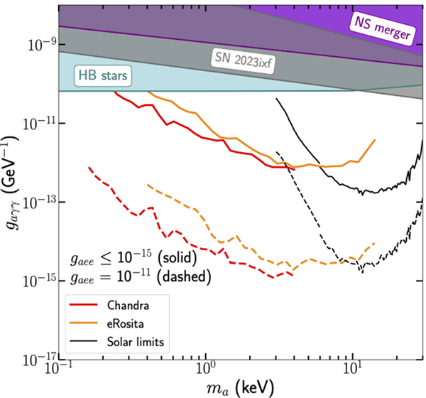 图1: 类轴子-光子耦合强度随类轴子质量变化的95%排除限曲线,对比了钱德拉卫星(红线)和eROSITA卫星(橙线)的观测结果与太阳X射线既往限制(黑线),其中实线忽略了类轴子-电子耦合的情况,虚线表示固定耦合强度,图中同时标注了球状星团氦闪星(青色区域)、超新星SN 2023ixf(灰色区域)及中子星并合GW170817(紫色区域)的95%置信度限制区域。