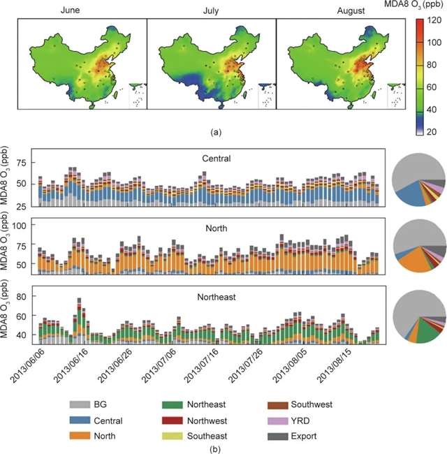 图 1. (a)中国各地观测和模拟的 MDA8 O3;(b)在 2013 年夏季(6 月、7 月和 8 月)对中部、北部和东北部地区使用消费方法进行模拟的源解析结果。图(a)中的点表示观测到的 MDA8 O3值。图(b)中的饼图表示各地区部门贡献的平均值。YRD 代表长江三角洲;export 表示国际出口。BG 表示 MDA8 O3的背景浓度。单位为 ppb。
