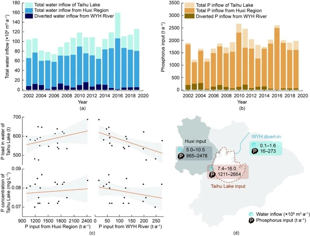 图1 引江济太对太湖磷负荷和磷浓度的影响。(a)2002—2019年间环太湖入湖总水量、湖西区入湖水量和望虞河引水入湖水量的年际变化。(b)2002—2019年间环太湖入湖磷负荷、湖西区入湖磷负荷和望虞河引水入湖磷负荷的年际变化。(c)2002以来湖西区入湖磷负荷与望虞河引水入湖磷负荷对太湖磷负荷和磷浓度的影响。数据点代表不同年份。(d)2002以来太湖、湖西区和望虞河的入湖水量和磷负荷空间分布。数据代表2002—2019年间水量和磷负荷的变化区间。