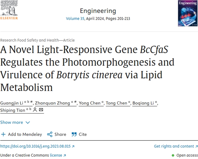 中国科学院植物研究所田世平教授团队在《Engineering》发表了题为“A Novel Light-Responsive GeneBcCfaSRegulates the Photomorphogenesis and Virulence ofBotrytiscinereavia Lipid Metabolism”的研究论文,李广锦、张占全为共同第一作者。