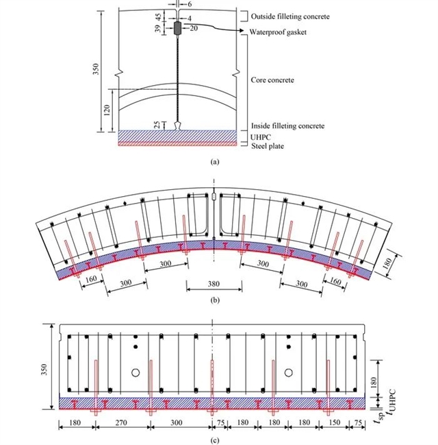 钢UHPC复合材料加固的纵向节理:(a)细节;(b)几何尺寸;(c)横截面