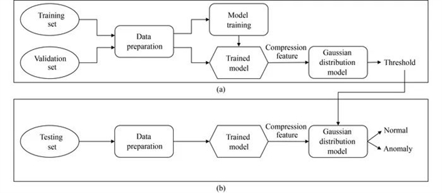 异常检测的流程图:(a) 训练过程;(b) 测试过程