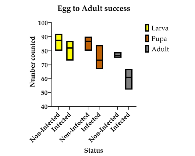 图1. LJV对幼虫(黄),蛹(橙)和成虫(灰)斑翅蝇羽化成功率的影响