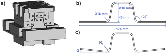 (a) 冲压模具示意图;(b) 欧米伽零件几何形状;(c) 用于评估试样凸缘回弹的测量α角。