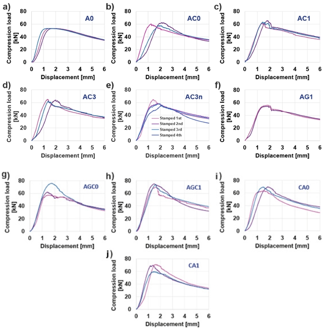 实验材料选用1.95 mm厚的AA5754 H111铝合金板、0.6 mm厚的CFRP预浸料 (650 g/m²,36%环氧基质) 以及0.3 mm厚的GFRP层 (300 g/m²,38%环氧树脂)。润滑剂使用RENOFORM 10ALWF 40LB。试样制备过程包括坯料准备、冲压连接和欧米伽形件冲压三个步骤,设计了多种试样组合 (如AC0/AC1/AC3等),以研究不同变量的影响。