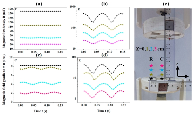 图10 磁通密度 (a, b) 和磁场梯度 (c, d) 随时间的变化