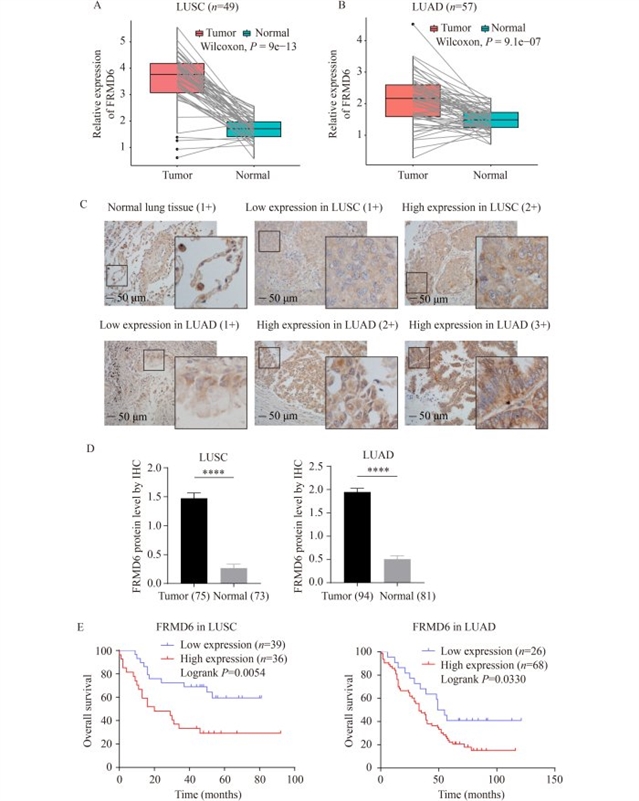研究团队首先分析了癌症基因组图谱(TCGA)数据库,发现FRMD6在LUAD和LUSC组织中的mRNA表达水平显著高于正常肺组织(图1)。进一步对169例肺癌患者(75例LUSC和94例LUAD)的组织样本进行免疫组化(IHC)检测,证实FRMD6蛋白在LUAD和LUSC中高表达,阳性率分别为72.34%和48%,且高表达与T分期(肿瘤大小)、N分期(淋巴结转移)显著相关,预示更差的生存率。