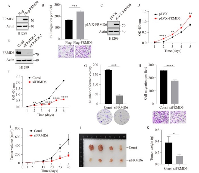 为明确FRMD6的生物学功能,研究团队在肺癌细胞系H1299中过表达或敲低FRMD6。结果显示,过表达FRMD6显著增强了细胞的迁移和增殖能力,而通过小干扰RNA(siRNA)敲低FRMD6后,细胞增殖与迁移能力均受到抑制。在动物模型中,将FRMD6敲低的H1299细胞移植至裸鼠皮下,26天后肿瘤体积和重量均显著小于对照组,表明FRMD6在体内外均促进肿瘤生长(图2)。