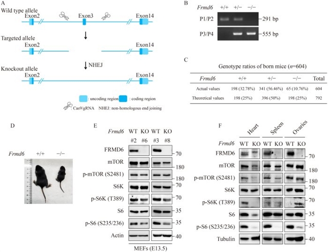 为验证体内机制,研究团队利用CRISPR/Cas9技术构建了Frmd6基因敲除(KO)小鼠。结果表明,Frmd6 KO小鼠出生率仅10.76%,显著低于理论值,存活个体体型明显小于野生型小鼠。在胚胎成纤维细胞(MEFs)和成年小鼠心脏、脾脏、卵巢组织中,Frmd6缺失均导致pS6K和pS6水平显著下降,表明FRMD6是维持mTOR信号通路活性的关键因子(图5)。临床样本分析进一步支持这一结论:肺癌组织中FRMD6与pS6的表达呈正相关,提示FRMD6通过激活mTOR通路驱动肺癌的进展。