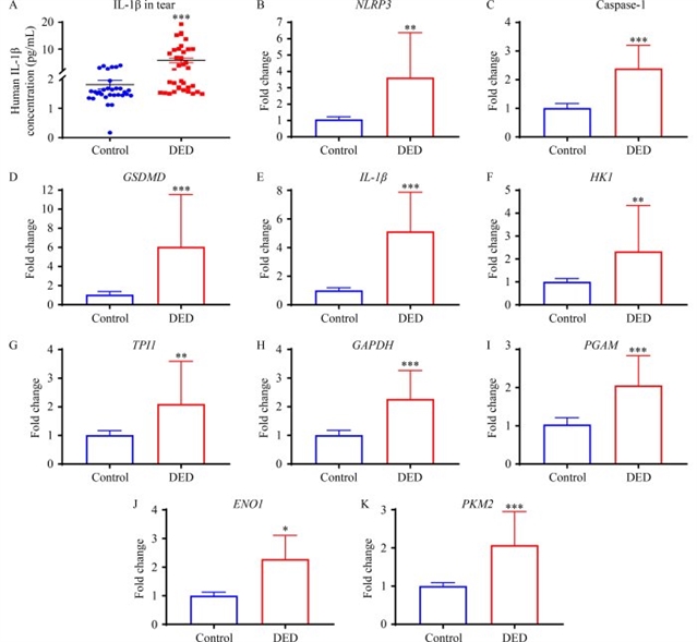 研究团队首先纳入36例临床确诊的干眼症患者和32例健康志愿者作为对照,通过结膜印迹细胞学收集眼表上皮细胞,并采集泪液样本进行分析。结果发现,干眼症患者泪液中炎症因子IL-1β的水平显著高于健康对照;同时,眼表上皮细胞中焦亡相关基因和糖酵解相关基因的表达均显著上调,提示糖酵解和焦亡可能共同参与了干眼症的发生发展(图1)。