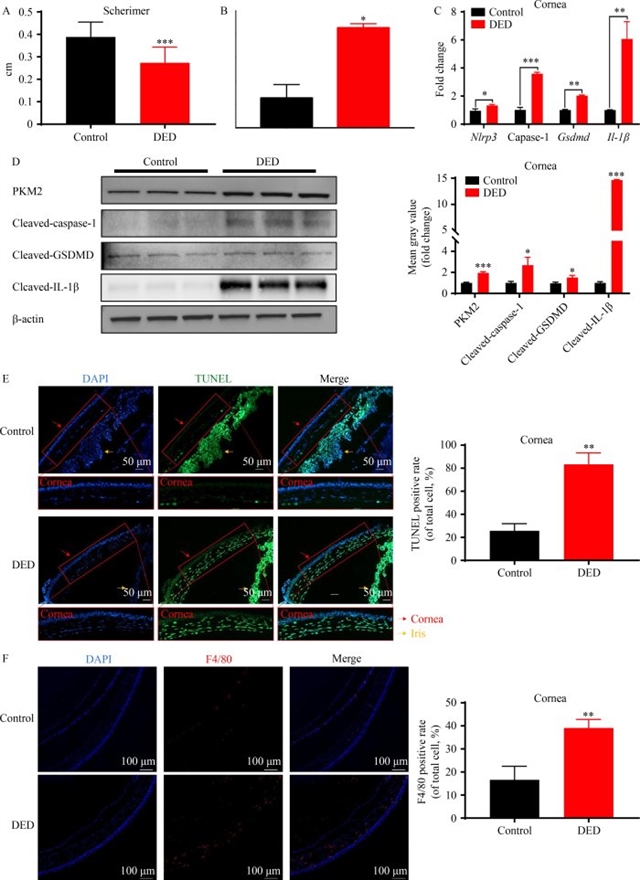 为进一步验证这一现象,研究团队采用MRL/lpr小鼠构建干眼症模型(MRL/MPJ小鼠作为对照)。实验显示,MRL/lpr小鼠的泪液分泌量显著减少,符合干眼症表型;其角膜组织中乳酸分泌水平升高,焦亡相关基因和蛋白的表达均显著上调。TUNEL实验显示,模型小鼠角膜组织中死亡细胞比例显著增加,免疫组化染色则观察到角膜巨噬细胞标记物F4/80的表达升高,提示巨噬细胞浸润增多(图2)。这些结果从体内实验层面证实了糖酵解异常和巨噬细胞焦亡在干眼症中的关联性。