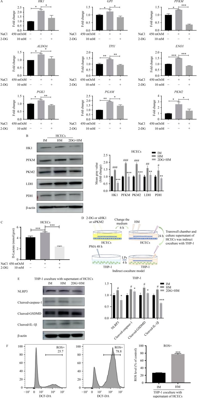 为明确高渗环境对角膜上皮细胞和巨噬细胞的作用机制,研究团队建立了体外间接共培养模型:将人角膜上皮细胞与THP-1来源的巨噬细胞置于Transwell小室中,通过高渗培养基模拟干眼症的高渗微环境。结果发现,高渗刺激显著上调了人角膜上皮细胞中糖酵解相关基因和蛋白的表达,并促进乳酸分泌;而使用糖酵解抑制剂2-DG预处理人角膜上皮细胞后,上述糖酵解相关分子的表达及乳酸分泌均被抑制。进一步分析共培养后的巨噬细胞发现,与正常渗透压组相比,高渗人角膜上皮细胞培养上清处理的巨噬细胞中焦亡相关蛋白表达显著升高,活性氧释放增加;而2-DG预处理或敲除人角膜上皮细胞中糖酵解关键基因后,巨噬细胞的焦亡水平及活性氧释放均显著降低(图3-5)。这表明,高渗环境通过诱导角膜上皮细胞糖酵解重编程,可能通过乳酸等代谢产物促进巨噬细胞焦亡,进而加剧炎症反应。