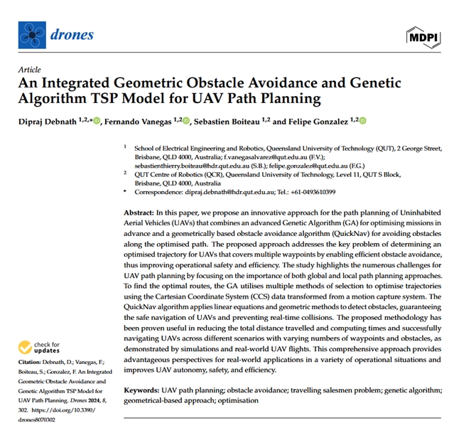 本文提出了一种无人驾驶飞行器 (UAV) 路径规划的创新方法,该方法结合了先进的遗传算法 (GA) 来提前优化任务,以及基于几何的避障算法 (QuickNav) 来避开优化路径上的障碍物。